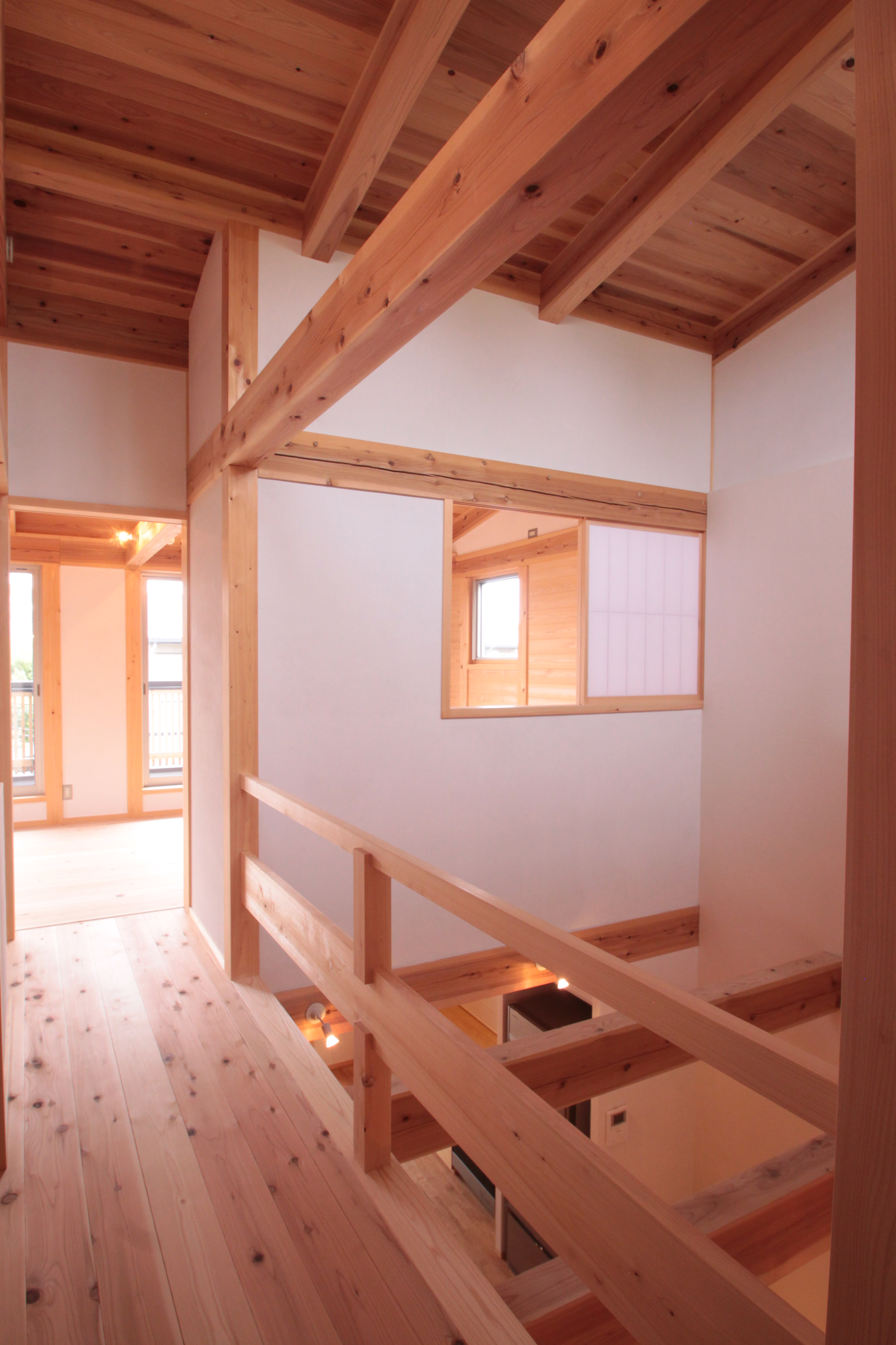 吹き抜けにはハイサイドライト(壁の高い位置に取り付けられる窓)を設けることで光と風を採り、明るく気持ちの良い空間を作り出しています。