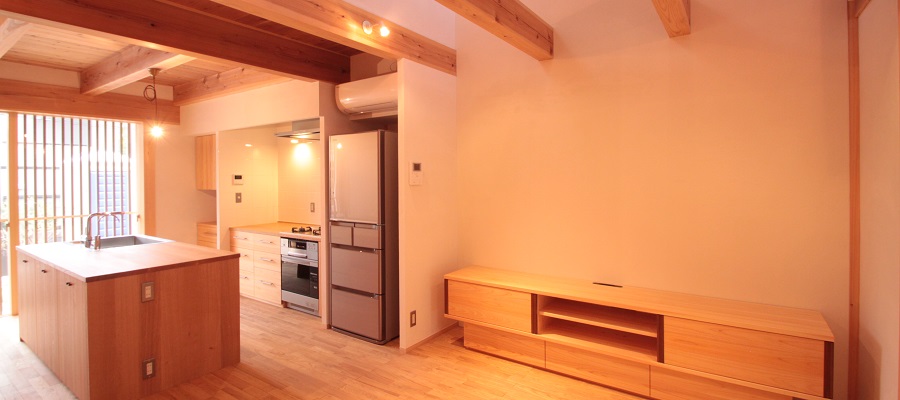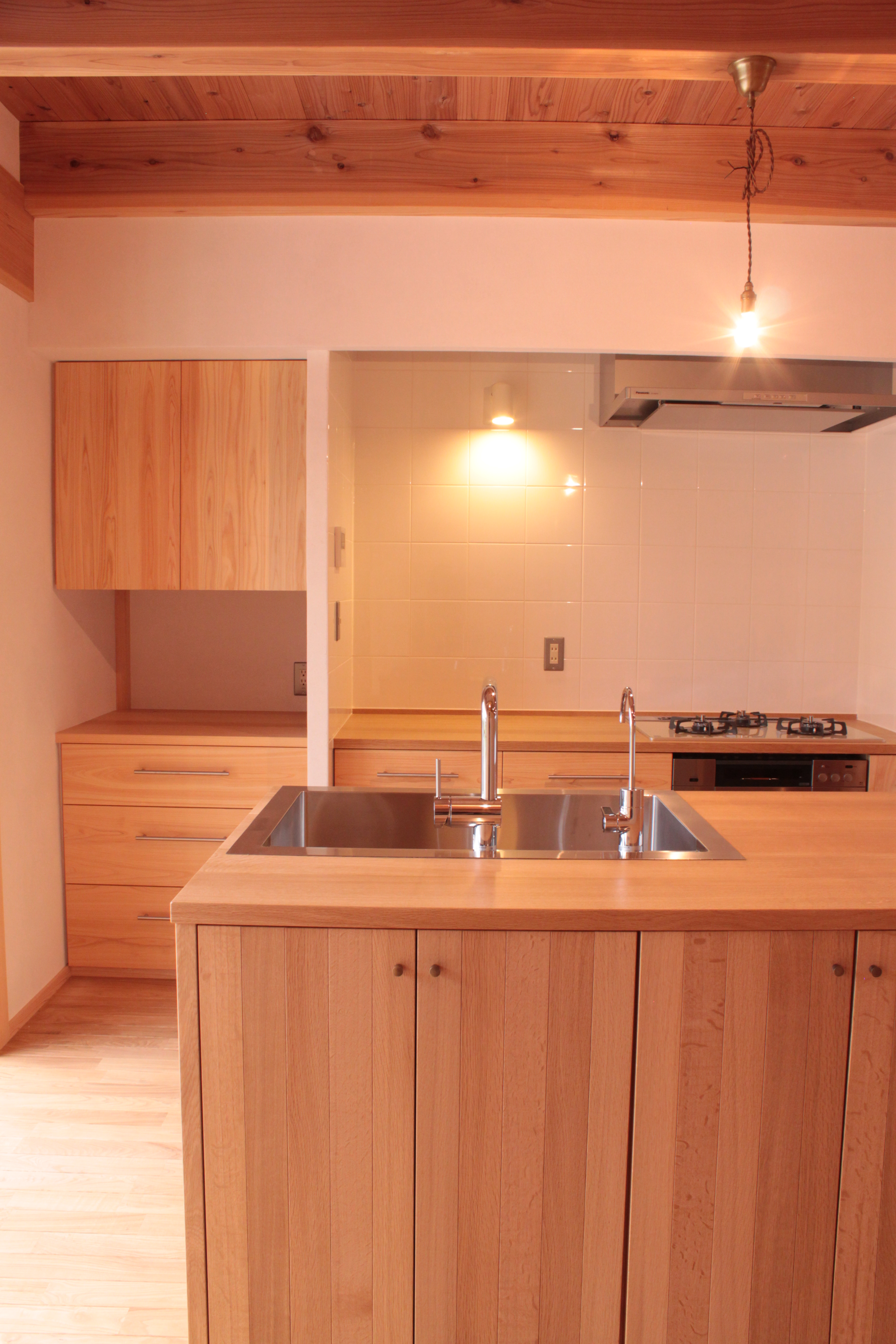 調理場はアイランド型にして、家族みんなで料理を楽しめるようレイアウトしました。カウンターや食器棚は、ナラとヒノキで製作しました。