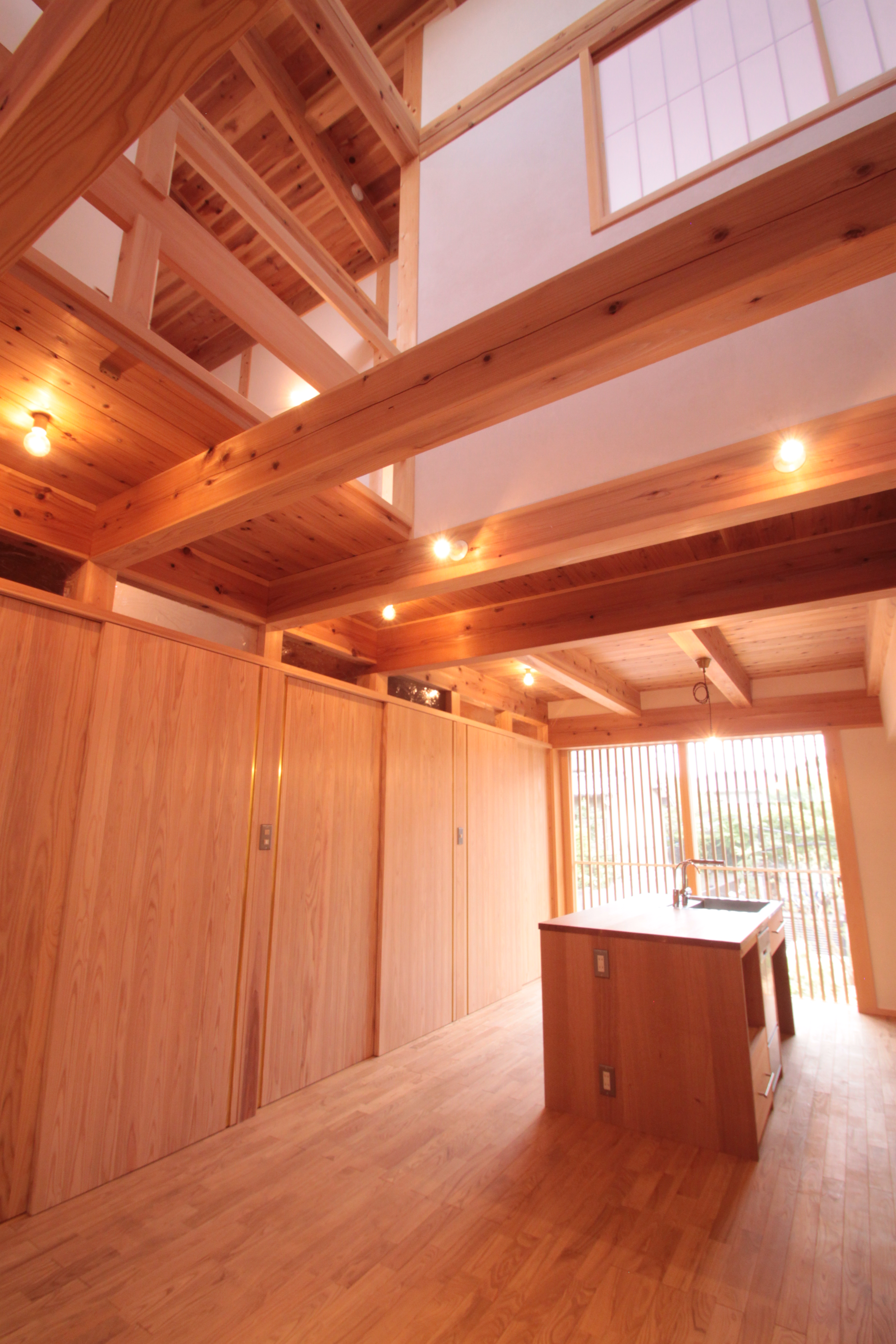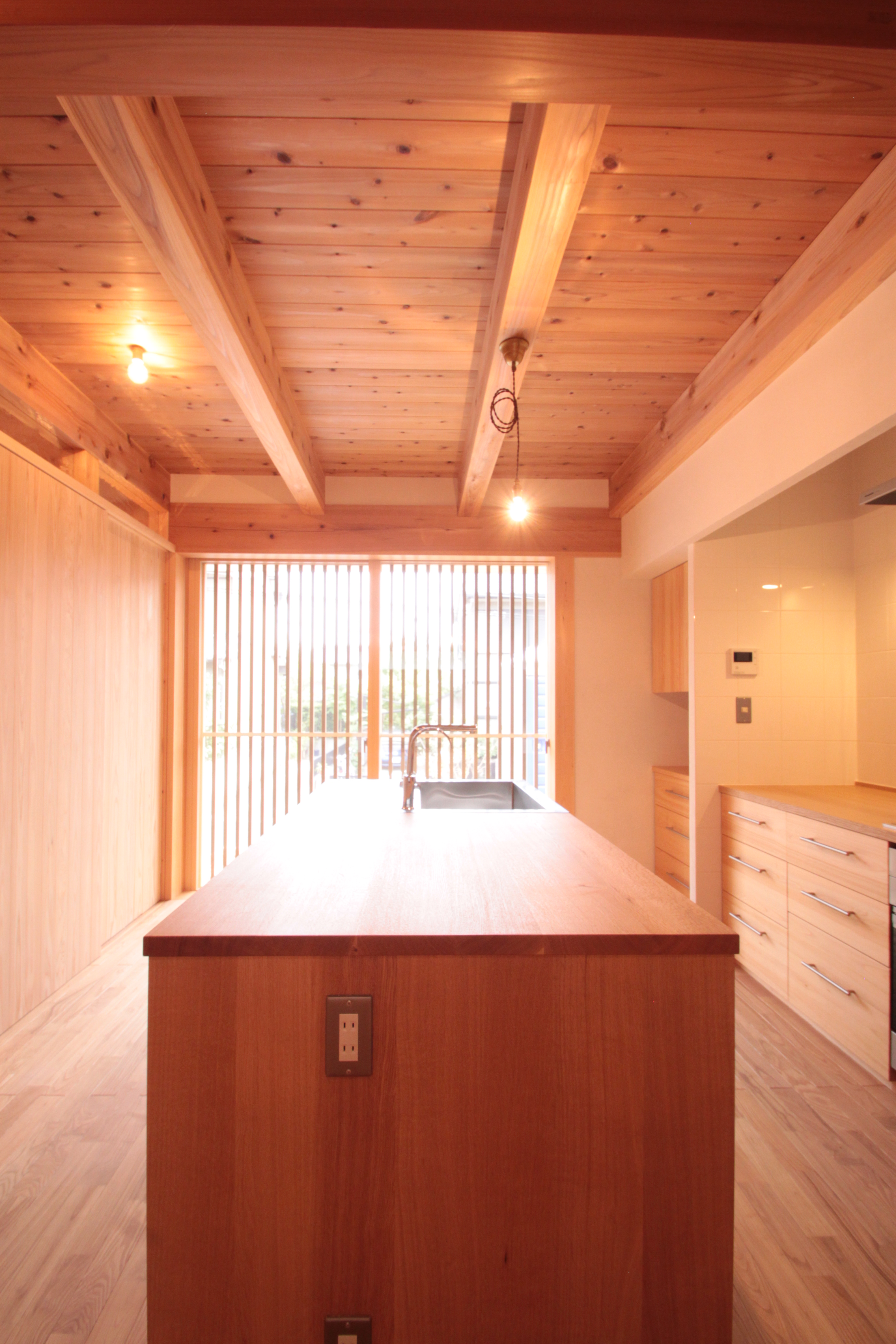 大きな窓から光が入る明るいキッチンです。奥に見える格子戸は、引き込んで壁に納めれば全開放することができます。