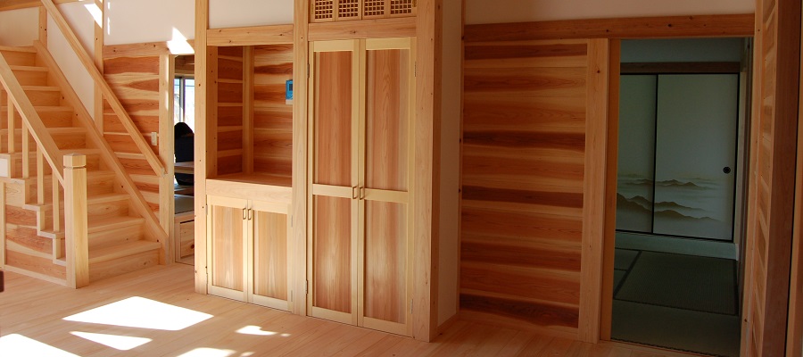 敷地の段差を利用した地下の物入れから小屋裏まで、4層構造の住まいです。東南側に大きな吹き抜けをとることで家全体が明るくなりました。2世帯住宅で玄関はひとつですが、親世帯・子世帯それぞれに通じる扉が二つあります。