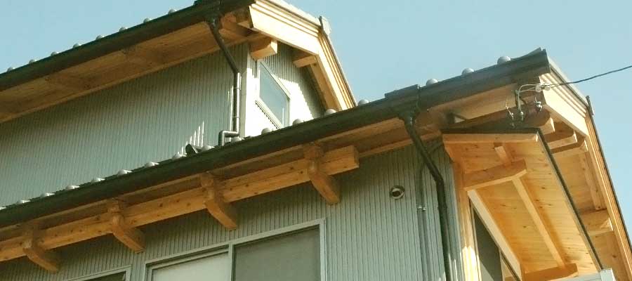 柱にあけたほぞ孔に軒板をさしこみ「鼻栓」で止めています。こんなしくみが「見えている」のもおもしろいですね。